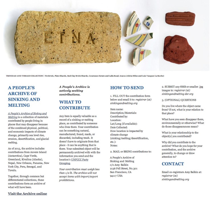 Arkivet er en voksende samling av gjenstander. Disse er bidrag fra folk på slike steder som enten kan forsvinne eller som allerede har blitt ubeboelige – på grunn av de fysiske, politiske, og økonomiske følgene av klimaendring, f.eks. smeltende isbreer, stigende havnivå, kyst-erosjon og forørkning.