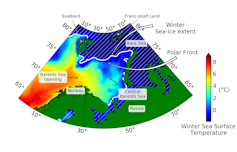 At the same time, the sea surface temperature difference across the Polar Front has increased, with southern temperatures increasing at a faster rate than those to the north. The average between 1985 and 2004 was -1.2°C in the north and 1.5°C in the south, while between 2005 and 2016 it was -0.6°C in the north and 2.6°C in the south. Clearly, from 2005 the Barents Sea has become too warm for sea ice to exist south of the Polar Front. The question then is why is the Barents Sea getting warmer?