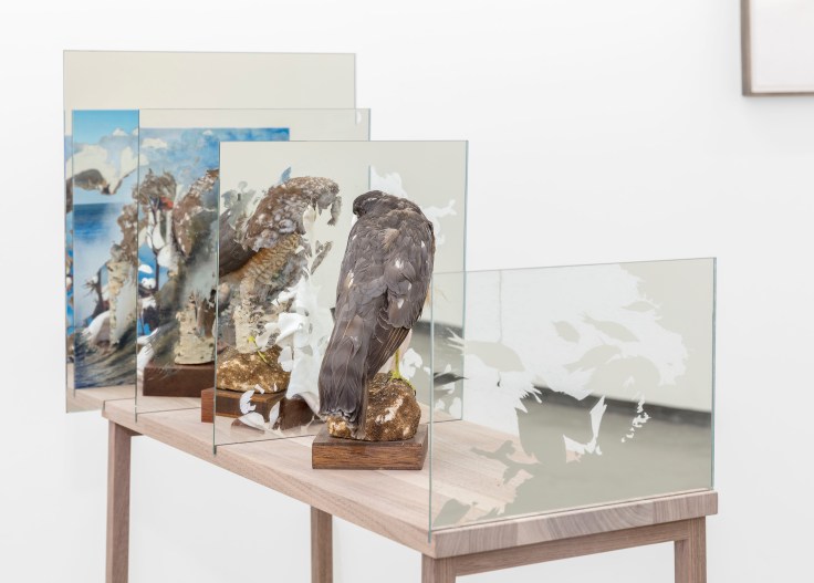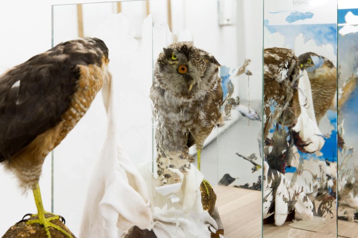 Installasjon, speglar, fuglar, foto, treverk og bomull. Foto: Uli Holz. Courtesy of Tokonoma.