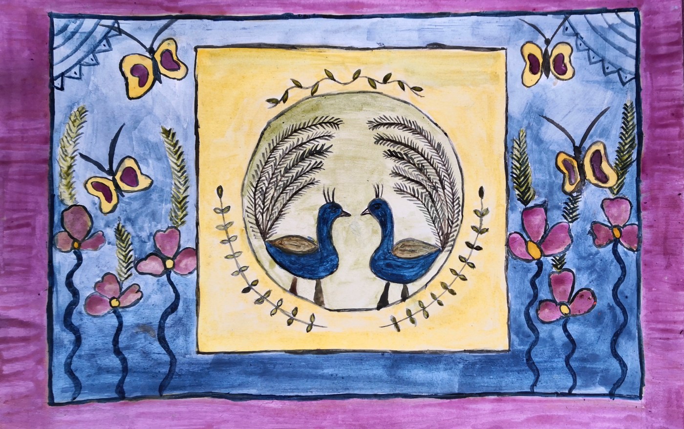 Priti bor i slummen i Kolkata. Jeg vet ikke hvor mange familiemedlemmer som sover og spiser i samme rom. Også nå i koronatider…. Priti sier ikke mange ord, men maler seg inn i oss. Vidunderlige fugler, sommerfugler, blomster.