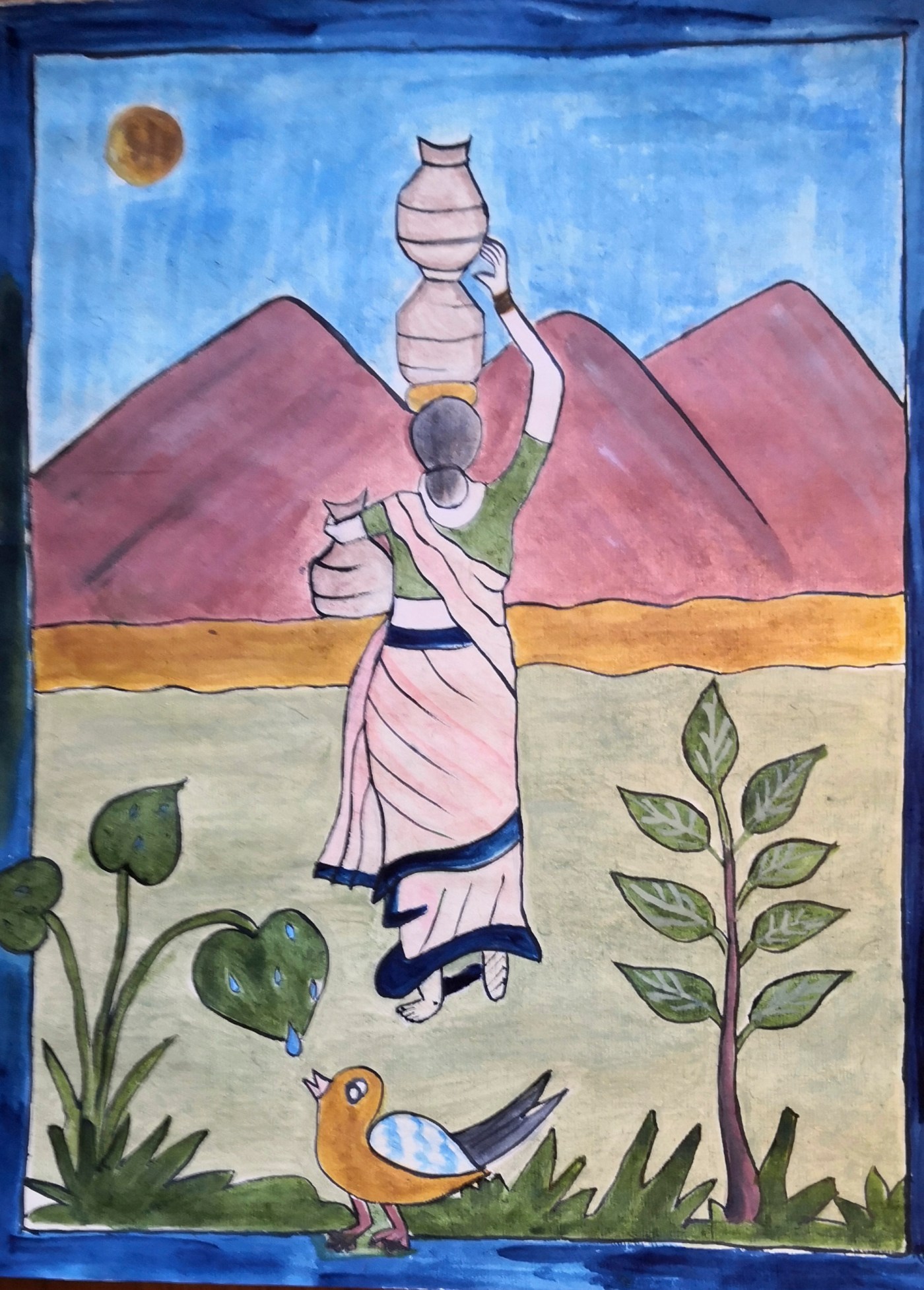 Kvinnen går med vannkrukken. Hun må hente «dråpe for dråpe» vann, hver dag. Ikke noe hus å se i bildet. Bare horisont. Vannet ligger på bladene. Fuglen vet det og drikker. Keya viser oss det.