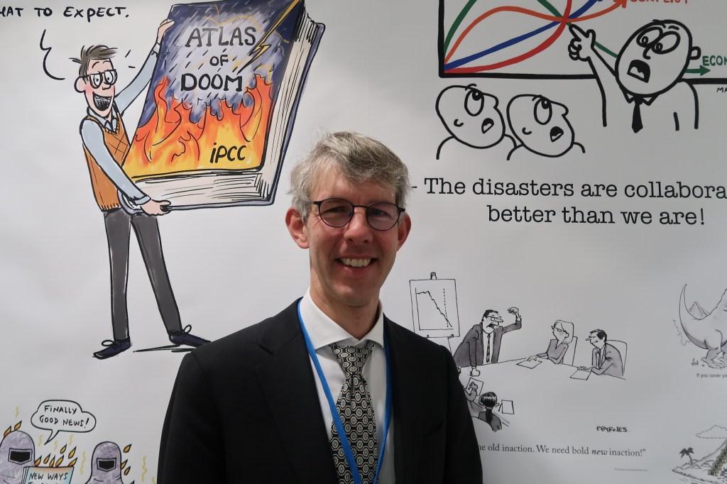 Karikaturtegnere har sitt eget språk. Langs en av blåsonens mange hovedsluser henger en hvit tavle med seksti klimategninger som kaller på latteren, selv om den lett setter seg fast i halsen. Maarten van Aalst har vært sentral i dette initiativet. Han er direktør for Røde Kors og Røde Halvmånes klimasenter og professor ved Universitetet i Twente, Nederland. – Humor er ærlig, sier han. Det er genuine følelser, tegningene skaper resonans hos folk.
