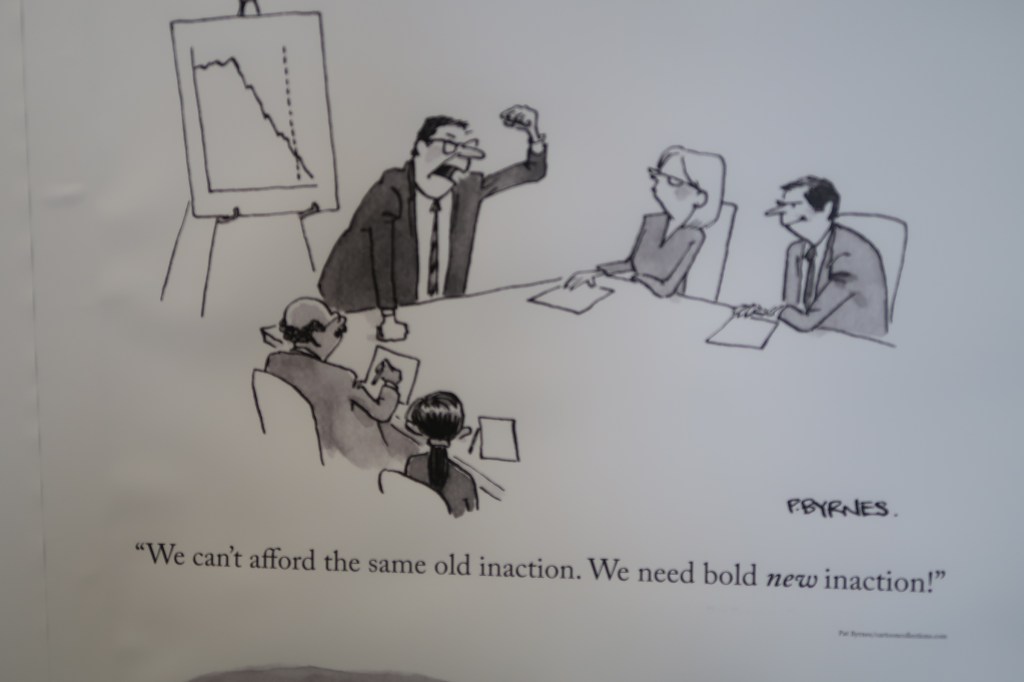 Flere av tegningene peker på absurde globale forskjeller. Rebeka Ryvola tegner en ivrig hjelper fra Vesten, omgitt av begreper om samarbeid og inkludering. Hun moraliserer over «stakeholders» som ikke engasjerer seg. Kan hende har de nok med å berge livet, og de snakker helt sikkert et annet mer jordnært språk.
