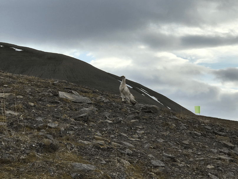 De levende hørte vi så sjeldent fra at hver gang en av dem gav lyd fra seg, var det umulig å ikke legge merke til det: Latteren fra en arktisk rev i fjellskråningen, lokkeropet til en ensom svalbardrype, pipene til en snøspurv – hver lyd helt for seg selv, som den var pakket inn i stillheten; aldri i symfoni med hverandre og småkrypenes gnikking og flyving, raslingen i den døde vegetasjonen eller i ett med vindens sus i trekronene.