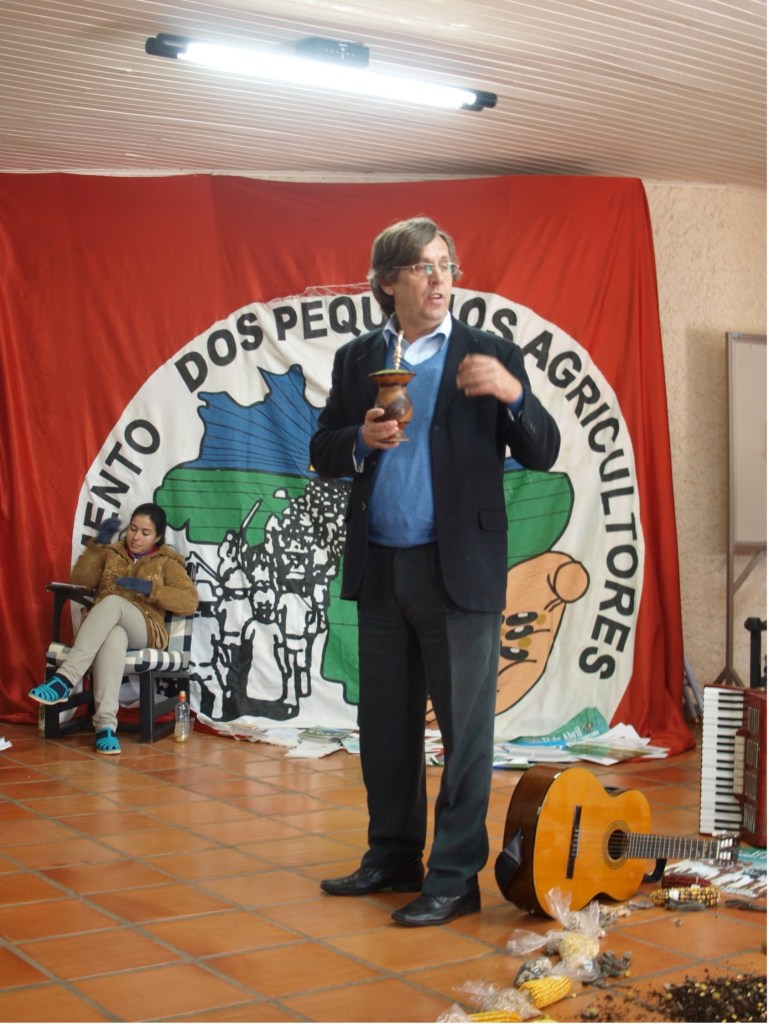 Jeg befinner meg i det brasilianske innlandet, helt vest i staten Santa Catarina, der organisasjonen MPA (Movimento dos Pequenos Agricultores, fritt oversatt til Småskala-bøndenes bevegelse) holder samling. Skolebygget i mur som tjener som forsamlingslokale er omgitt av gyldne åkre med mais og soya. Her inne er det pause i møtene. Folk i røde t-skjorter med organisasjonens hvite emblem stimler sammen rundt bordene som står i ring i forsamlingslokalet.