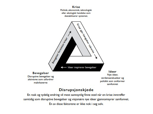 Men i alle disse tilfellene krevdes det et tredje element for å få i stand endring: At det forelå nye ideer. Økonomen Milton Friedman skal ha sagt at selv om en krise er en mulighet for endring, er det slik at «når krisen inntreffer, vil det man gjør være avhengig av hvilke ideer som er tilgjengelig».[x] I tilfellene ovenfor var nye ideer om raselikhet, kvinners rettigheter og demokratisk frihet en viktig inspirasjon for de revolusjonære bevegelsenes suksess. Tiden etter finanskrisen i 2008 viser hva som skjer når det ikke foreligger samlende nye ideer. To spisser på trekanten var til stede: Selve krakket og Occupy-bevegelsen som krevde endring. Men det som manglet, var de nye økonomiske ideene og modellene som skulle utfordre det sviktende systemet (best oppsummert i bevegelsens slagord: «Okkuper alt, krev ingenting»). Som følge av det ble de tradisjonelle maktmenneskene i investeringsbankene reddet ut av situasjonen, og det gamle finanssystemet fortsatte som før. Dette ville neppe skjedd i dag, når nye modeller som økonomi etter vekst og ny monetær teori har fått en langt sterkere posisjon blant folk flest.