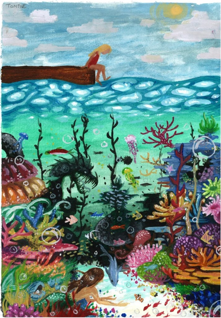 Bakken er skarp, den føles hard under føttene mine. Tusen små steiner presses mot huden min. Jeg nærmer meg brua som fører meg over til brygga, der de store barna bader, der jeg ikke får lov. Mamma ligger på stranda og leser bok, «Bare 10 minutter til, så kan jeg bli med deg ut på brygga å bade, jeg lover» sa hun, men det sier hun hver gang. Enten så lurer hun meg, eller så varer 10 minutter i en evighet. Jeg gidder ikke vente mer, jeg vil bade, det er alt for varmt og sola steker på huden min. Jeg setter foten min på brua. Jeg har ikke sko på, så når jeg treffer overflaten, svir det. Jeg trekker baderingene godt opp på armene før jeg setter den andre foten på brua. Det svir, men denne gangen visste jeg at det ville gjøre vondt. Jeg tar ett steg og så ett til før jeg kommer meg over. Jeg tråkker ned på betongen, den er skarp og varm. Det gjør vondt å gå, og jeg vil komme meg ut i vannet så fort som mulig. Jeg går bort til bryggekanten og bøyer meg ned. Jeg ser blåskjellene som er festet under brygga og strekker ut hånden for å plukke ett. I det jeg strekker meg ned, tilter kroppen min ut og inn i vannet. Temperaturen er kjølig mot huden min. Det er behagelig å flyte i vannet, det er noe av det jeg liker best. Jeg åpner øynene, det er en ny verden under vann. Jeg en fiskestim som svømmer utover mot det mørke dypet, der solens stråler bryter med den mørke kontrasten. Jeg ser krabber som klatrer på steinene og agnet fra de andre som fisker dem. Jeg hører en svak dur fra latteren til de andre som bader, jeg føler meg trygg og ikke alene. Det er ikke lenge jeg er under vann før baderingene mine trekker meg opp mot overflaten. Jeg koser meg i vannet, som om jeg var født for å være der.