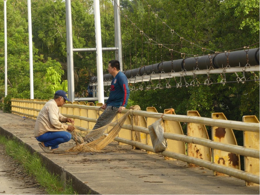 / Fishermen preparing a net next to a pipeline outside of Barrancabermeja. (Maxy Guez / Jacobin)